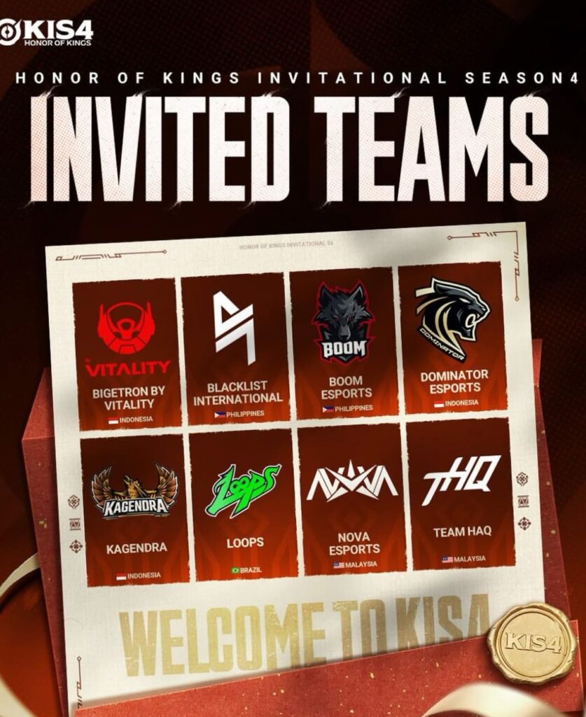 Panitia telah mengumumkan delapan tim profesional undangan yang akan bertarung memperebutkan gelar juara di KIS Season 4. Daftar tim ini didominasi oleh perwakilan kuat dari Asia Tenggara, termasuk tiga tim kebanggaan Indonesia yaitu Bigetron by Vitality, Dominator Esports, dan Kagendra. Filipina mengirimkan dua wakil kuatnya, Blacklist International dan BOOM Esports, sementara Malaysia diwakili oleh NOVA Esports dan Team HAQ.